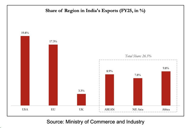 DS: The US and EU together account for over a third of India’s exports (19.8% and 17.3% respectively in 2025). The UK added another 3.3%. By contrast, regions that are expected to drive future global export growth - ASEAN (8.9%), North-East Asia (7.8%), and Africa (9.8%). But these remain under-tapped. India should deepen engagement with its neighbors in Asia and build stronger commercial ties with Africa. The latter is a rapidly growing consumer market. At the same time, negotiating with the US remains critical, given that many of our labor intensive sectors rely on American demand.
