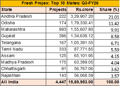 A couple of super mega projects saw the aggregate fresh investment by the Foreign entities increase by 69.33 percent to Rs 2,30,111.27 crore. This was despite the decline in the number of new projects from 141 in Q2/FY26 to 115 in Q3/FY26. The Foreign share increased to 14.66 percent from 9.06 percent (+5.60 pp), partially cushioning the broader private slowdown, but also indicating higher dependence on a small set of super/mega projects. A Rs 98,000 crore AI Data Centre of Digital Connexion at Visakhapatnam, Andhra Pradesh and a Rs 24,000 crore Closed Loop Pumped Storage Project of Greenko Energies in Telangana were the two super mega projects announced in Private (Foreign) sector.